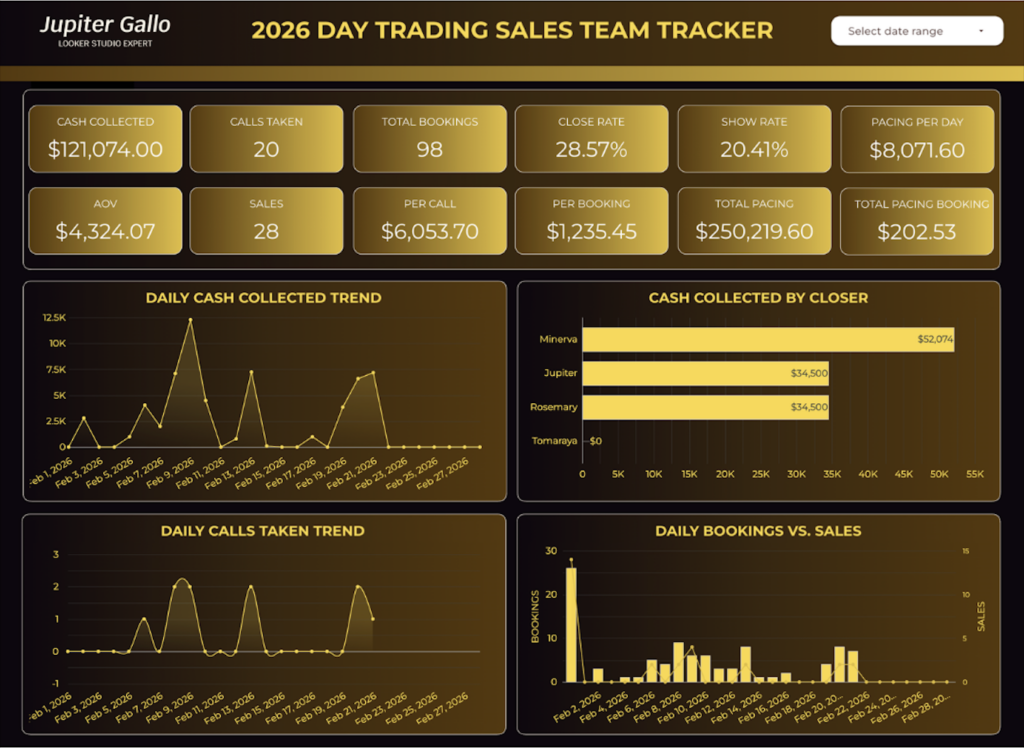 Looker Studio for Day Trading Sales Team Tracker. This dashboard pulls data from Google Sheets to track bookings, calls, sales, revenue, pacing, and closer performance.