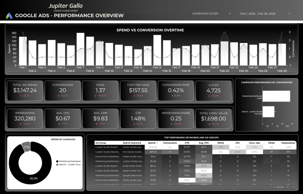 Get a custom Looker Studio Google Ads dashboard to track CTR, CPC, ROAS, and optimize ad spend.