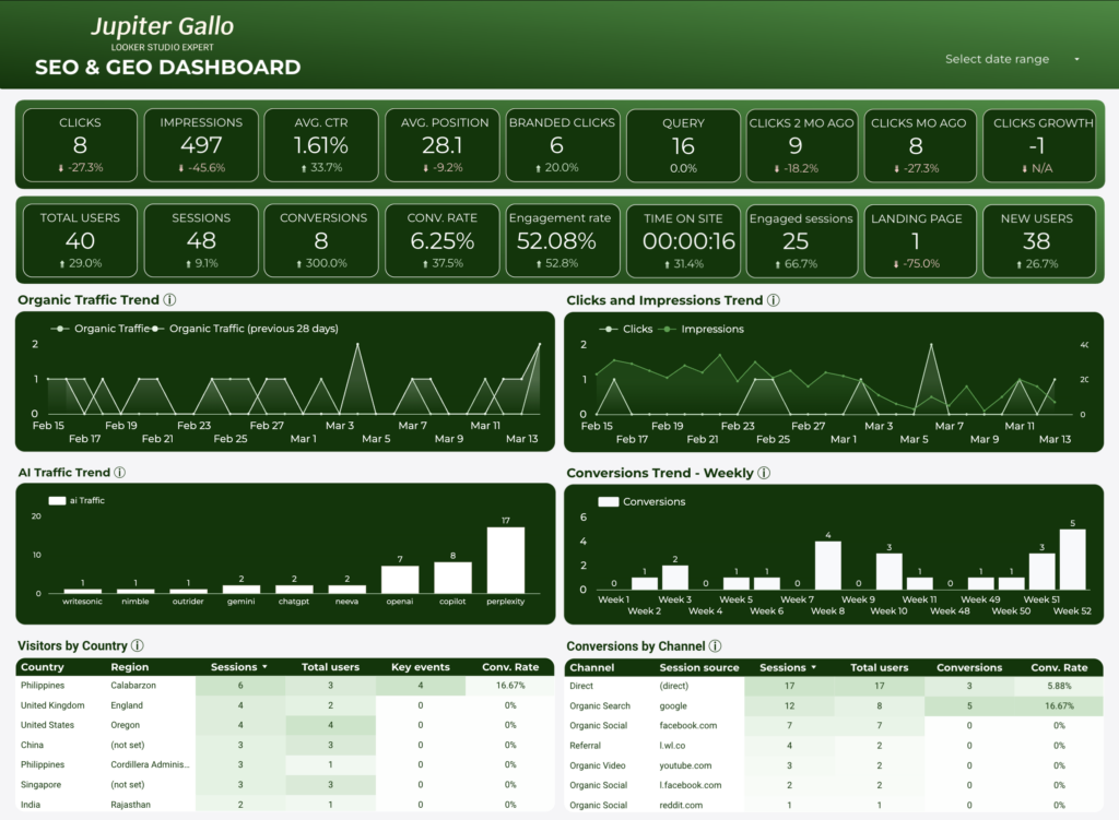 This SEO & GEO dashboard provides a clear view of clicks, impressions, conversions, and traffic trends by region and channel. Track organic performance, see which markets are driving results, and monitor AI-driven traffic insights — all in one interactive Looker Studio report designed for fast, actionable decision-making.