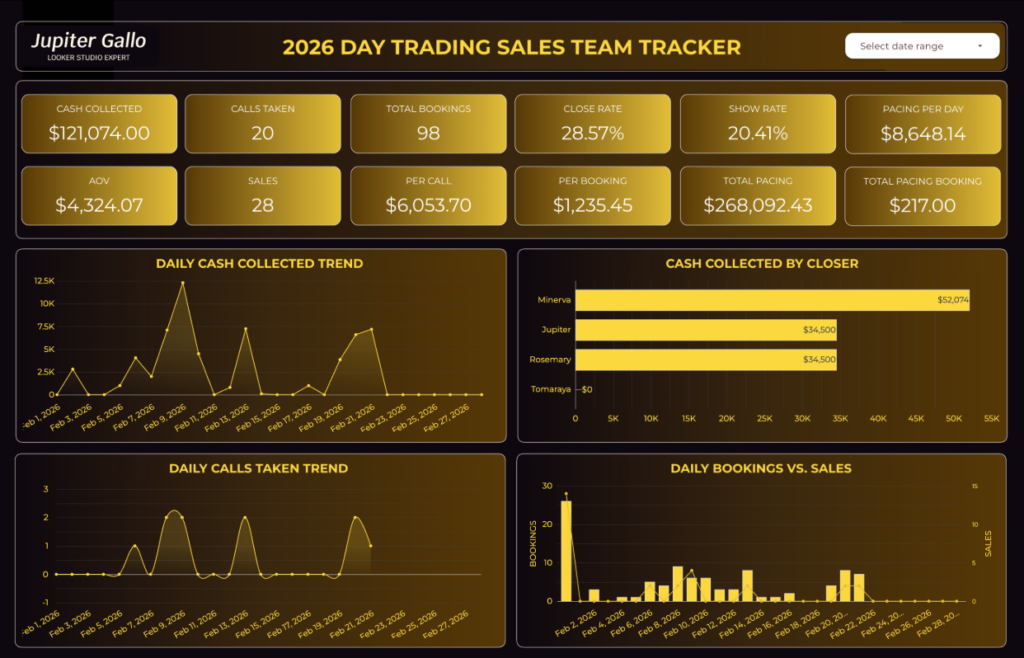 Looker Studio Sales team dashboard tracking bookings, calls, sales, revenue, pacing, and closer performance.